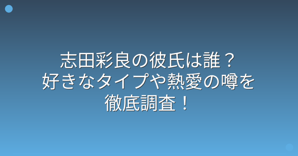 女優として活躍中の志田彩良さんの恋愛事情が、ファンの間で話題になっていますね。 清楚な雰囲気と演技力で人気を集める志田彩良さんですが、彼氏はいるのでしょうか? そこで今回は、志田彩良さんの彼氏や熱愛の噂、好きなタイプについて詳しく見ていき... -